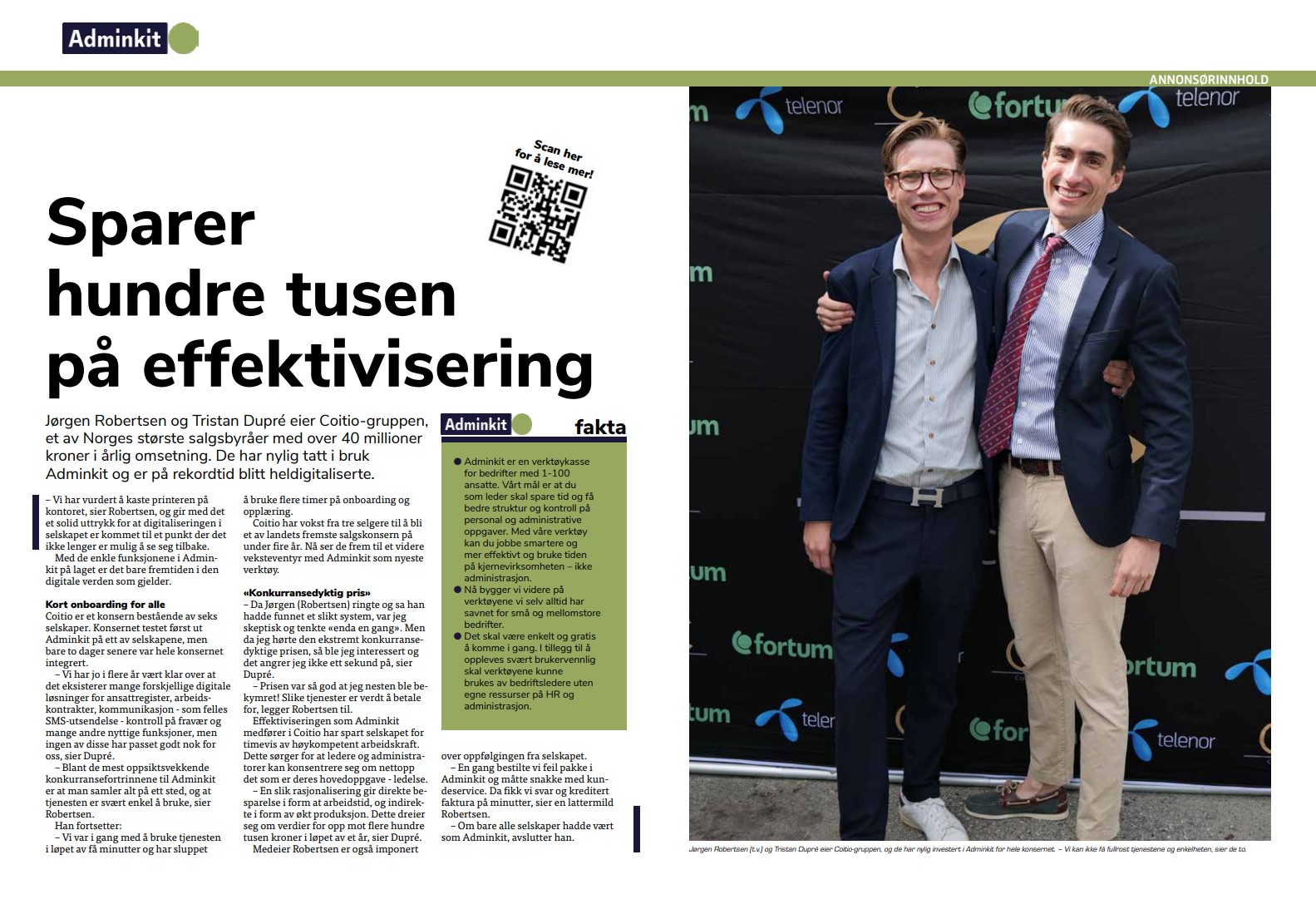 Jørgen Robertsen og Tristan Dupré eier Coitio-gruppen, et av Norges største salgsbyråer med over 40 millioner kroner i årlig omsetning. De har nylig tatt i bruk Adminkit og er på rekordtid blitt heldigitaliserte.